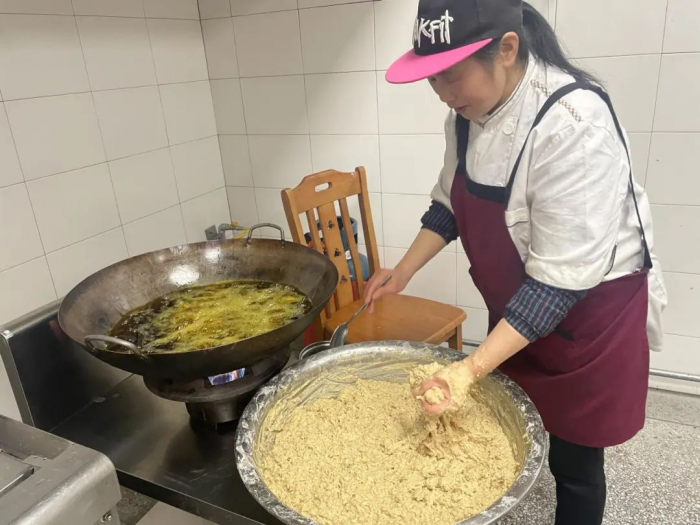 食堂的工作人员准备香肠、腊肉、炸园子等春节美食
