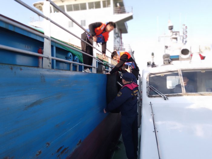 接警后,扫帚沟执法大队队员立即带领执法人员乘海巡12247艇赶往现场,途中与该轮取得联系,对船舶相关信息、生病船员具体症状等情况进行了解,同时联系县医院120急救中心,告知救护车船员上岸的海事码头位置信息,为救治伤员尽可能节省时间。接到伤员后,队员询问船员病症详细情况,并安抚其情绪。海巡艇迅速返回码头,将生病船员送上救护车。