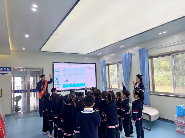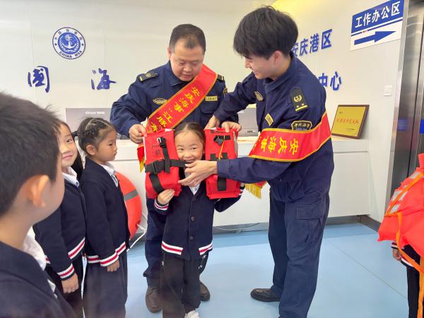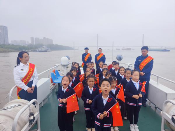 萌娃识江豚:趣味讲解点燃认知火花。活动一开始,海事青年志愿者利用可爱的江豚卡通图片和浅显易懂的语言,为小朋友们介绍了“长江小精灵”江豚的外形特征与生活习性。在轻松愉快的氛围中,志愿者引导小朋友们思考“怎样让江水更干净”“如何保护江豚的家”,在幼小的心灵中播下环保的种子。安全初体验:救生设备互动学穿用。针对幼儿园小朋友的年龄特点,志愿者们设计了简单有趣的“安全小达人”体验环节。在志愿者“一对一”的帮助下,萌娃们兴奋地试穿了救生衣,亲手扣上搭扣、系紧带子,完成救生设备实操体验。艇上探秘:甲板课堂亲触长江脉搏。随着海巡艇缓缓启航,小糖艺术团的小朋友们童声激情演唱《强军战歌》开启了最期待的巡航体验。志愿者们用简单易懂的语言介绍基本的航行知识,引导小朋友们观察江水颜色、了解母亲河的故事。问答互动:安全意识扎根童心。活动中穿插了趣味问答环节,“落水了该怎么办”“坐船要注意什么”等问题引发了小朋友们的热烈响应。他们高举小手,用稚嫩而坚定的声音回答问题,在互动中巩固了所学知识。志愿者们还为每位小朋友准备了特色小奖品,鼓励他们争做“长江小卫士”。