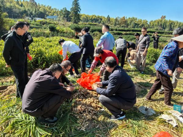 2025年11月5日,在安庆市人大常委会党组成员、秘书长齐申勇率领下,市人大常委会机关党委组织在职支部30余名党员干部,前往结对帮扶村——潜山市五庙乡新建村,开展“采生姜、购生姜、促振兴”主题党日活动。安庆人大常委会机关党员干部深入田间地头,与村民同劳动、话农事、谋发展,以实际行动践行帮扶责任,用“党建红”激活乡村振兴“新引擎”。