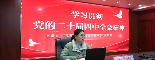12月18日上午,“党旗红”机关宣讲团走进安庆市民政局,开展党的二十届四中全会精神机关示范宣讲。市民政局党组书记江学文,党组副书记、市老龄委主任王征兵出席报告会,市、区民政系统党务干部30余人参加。