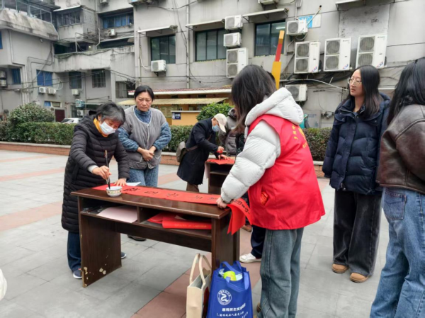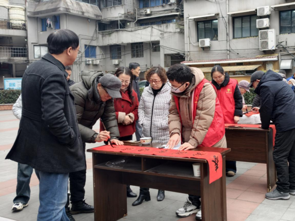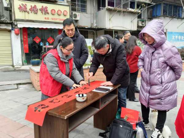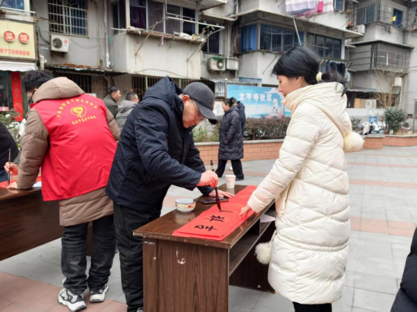 挥毫送福添年味。党员志愿者们分工协作、热情服务,细心为老书法家们抻纸、倒墨、晾干作品,忙碌的身影成为活动现场一道温暖的风景线。社区居民们或围立桌前欣赏笔墨神韵,或驻足墙边挑选心仪的春联,活动现场笑语不断、暖意融融。
