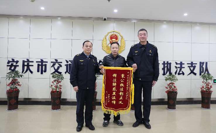 近日,安庆市交通行政执法支队暖意融融,潜山籍货运经营者胡先生专程赶来,将一面印着“秉公执法彰正义 释法解惑显温情”的锦旗郑重送到执法人员手中。这十四个熠熠生辉的大字,既是对交通执法工作的由衷认可,更是对支队践行初心、担当作为的深情礼赞,为冬日里的执法一线增添了一抹暖心底色。