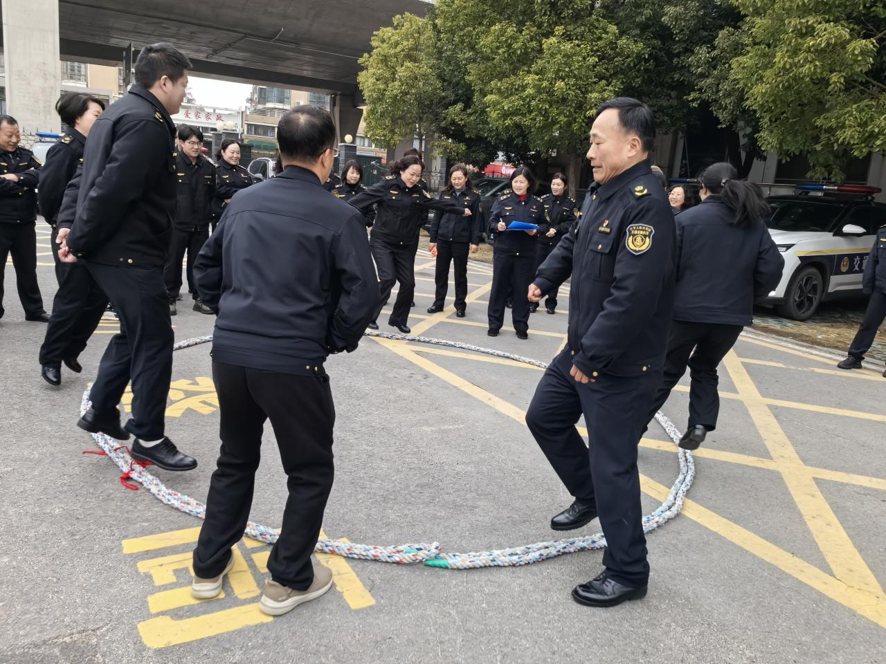 掼蛋比赛——方寸之间见谋略。平日里奋战在执法一线的干部职工抽签组队,全情投入。牌局之上,有的组合稳扎稳打,步步为营;有的则在逆境中沉着应战,通过精妙配合实现逆转。比赛过程紧张有序,大家在切磋牌技的同时,也增进了彼此的了解与信任,展现了交通执法队伍沉稳睿智、善于协作的另一面。跳圈比赛——律动之中展活力。如果说掼蛋比赛是“静”的博弈,那么“圈里圈外”跳圈比赛则是对个人反应能力和敏捷度的考验。场边加油声、欢笑声此起彼伏,大家在跳跃中释放了压力,在协作中凝聚了合力。