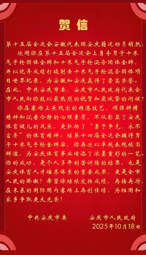 在第十五届全国运动会射击(步手枪)比赛中,安徽代表团安庆籍运动员胡凯一人独揽两金。10月18日,安庆市委、市政府向胡凯发出贺电,全文如下: