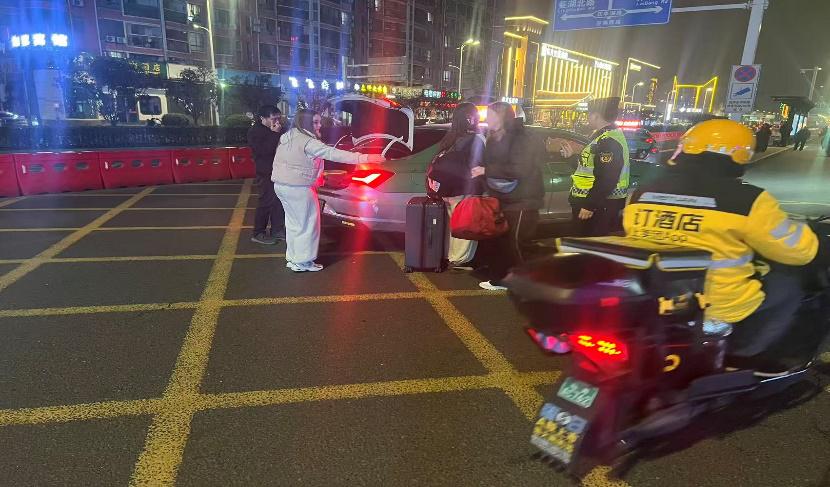 面对语言沟通障碍,执法人员迅速切换至“便民服务模式”,一边用简单的英语安抚对方情绪,缓解其焦虑;一边借助手机翻译软件,逐字逐句耐心核实三人的具体行程地址。确认信息后,执法人员第一时间联系现场出租车驾驶员,详细沟通乘客需求,确保行程信息准确无误。随后,执法人员主动协助三位旅客搬运行李、妥善安置,全程引导其安全上车,并再三叮嘱驾驶员严格规范经营、按表计费、安全平稳送达。